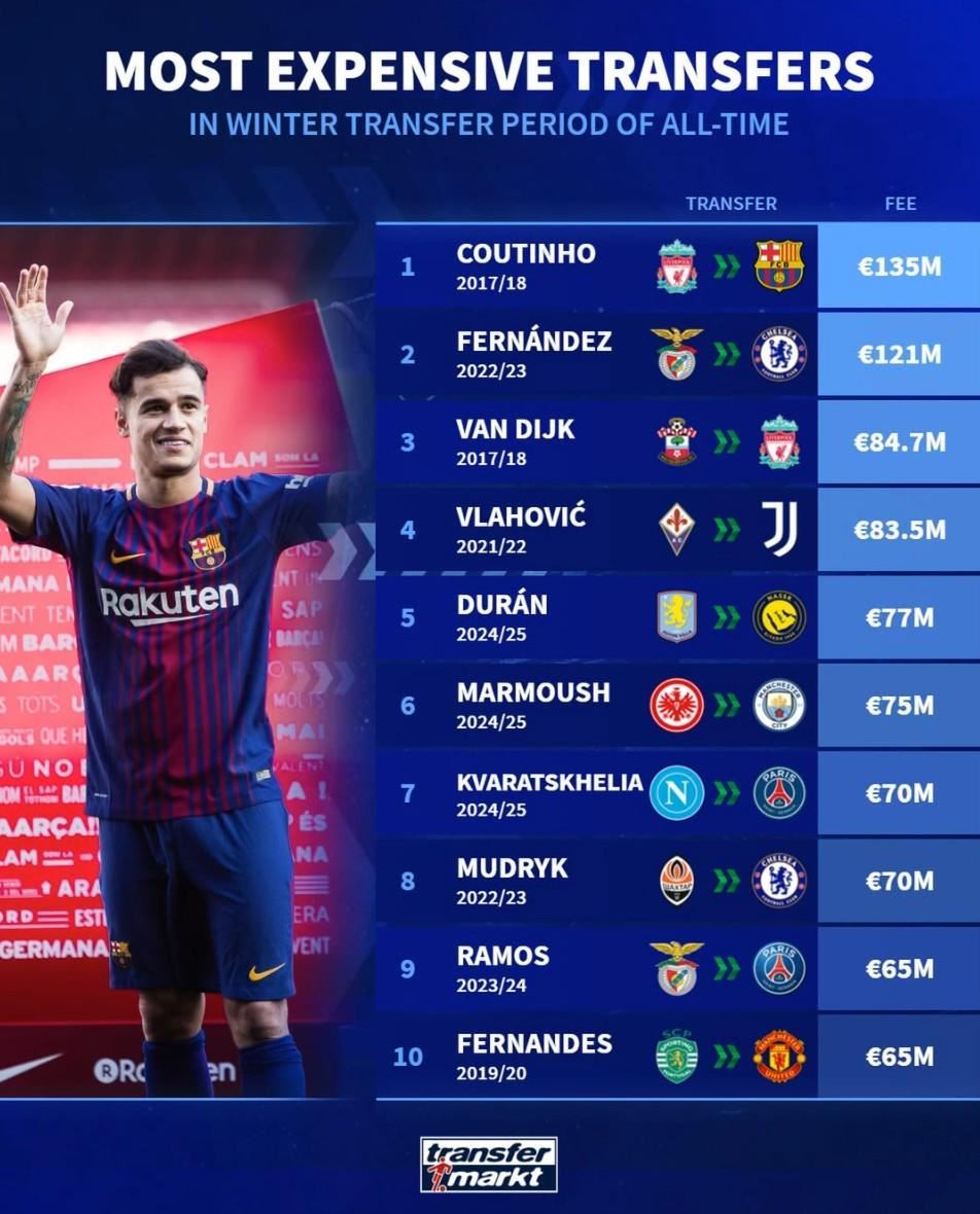 北京时间1月3日,德转列出了冬窗历史最贵的10笔交易,巴塞罗那在2018年冬窗1.35亿欧元从利物浦引进库蒂尼奥高居第一,切尔西2023年冬窗1.21亿欧元从本菲卡引进恩佐-费尔南德斯排名第二,这也是冬窗历史仅有的两笔超过1亿欧元的交易。
