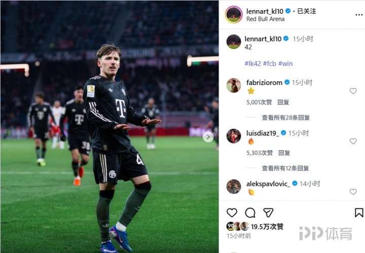 17岁的拜仁小将卡尔更新社交媒体,晒出了自己在热身赛中破门后模仿C罗庆祝动作的照片,并且配文“42”,这是他的球衣号码。