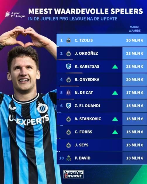 北京时间12月10日,在更新了比甲的球员身价之后,德转统计出了比甲目前身价排名前10的球员,布鲁日6人入围,希腊边锋措利斯3000万欧元第一,国际米兰旧将亚历山大-斯坦科维奇上榜,此外亨克的18岁新星卡雷察斯以及安德莱赫特的17岁新星德卡特同样榜上有名。
